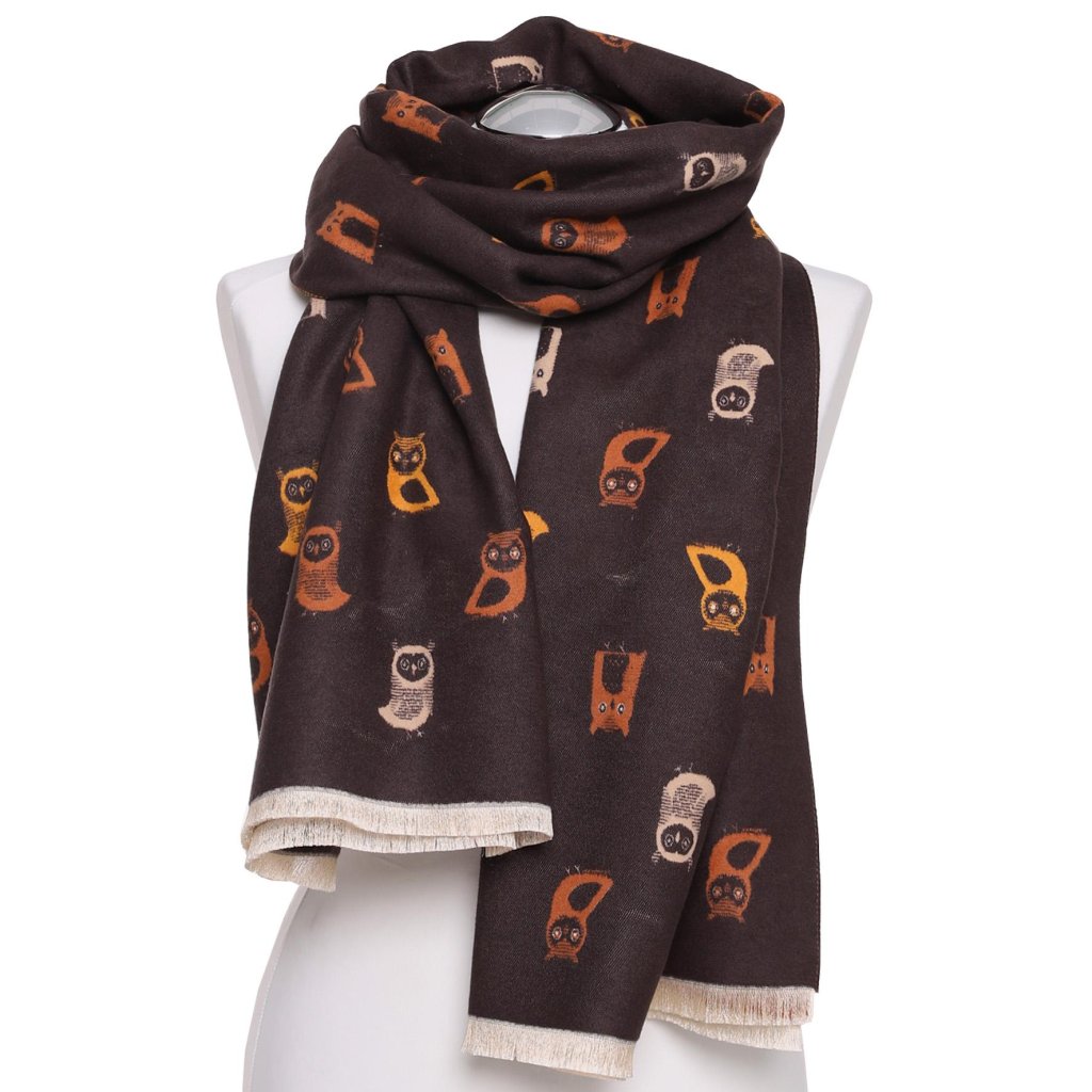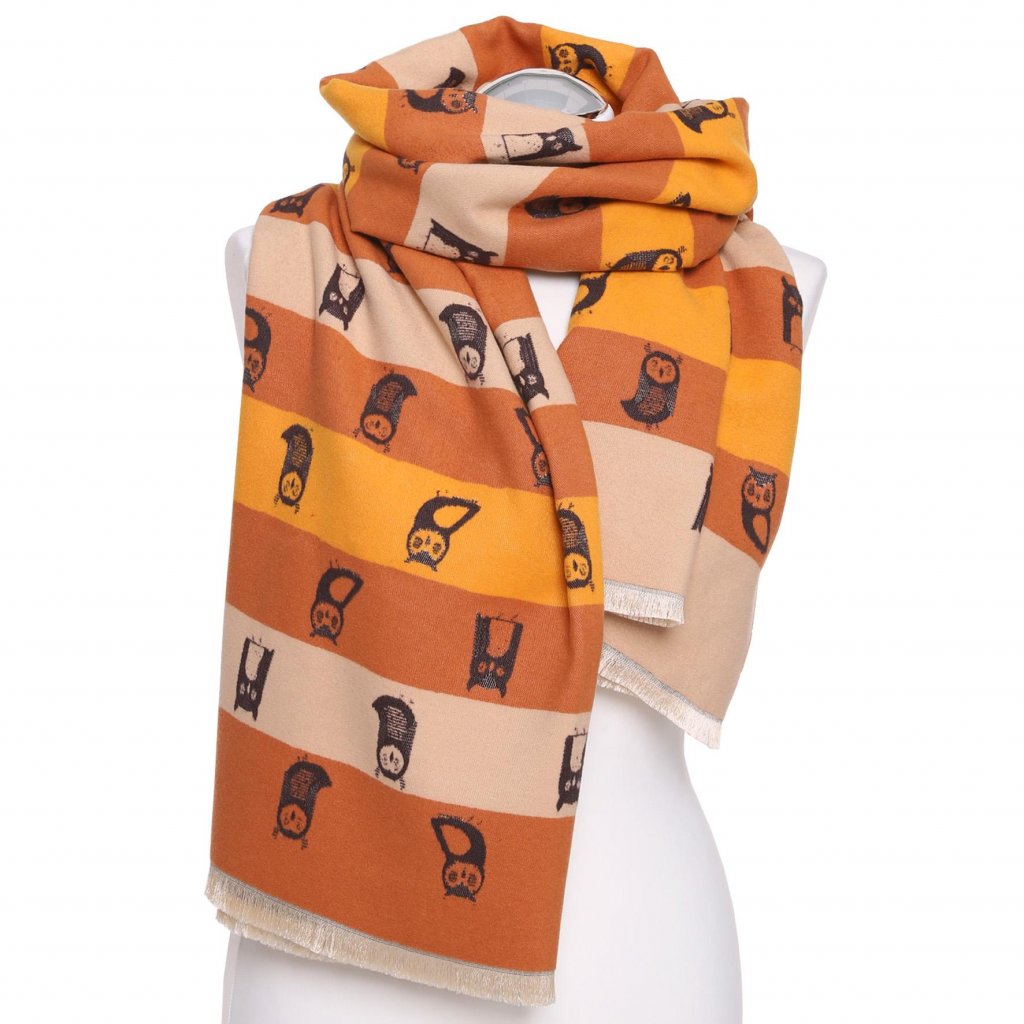 Dámská oboustranná šála se sovičkami je nejen funkčním doplňkem, ale i jedinečným a stylovým akcentem. Je z příjemného materiálu, vzhledem a jemností napodobuje kašmír.